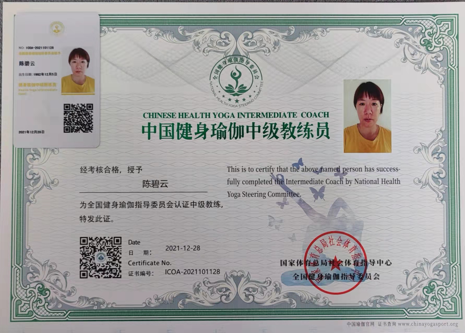 祝贺陈碧云在西安薄珈梵歌五星级场馆荣获国家体育总局健身瑜伽中级教练员
