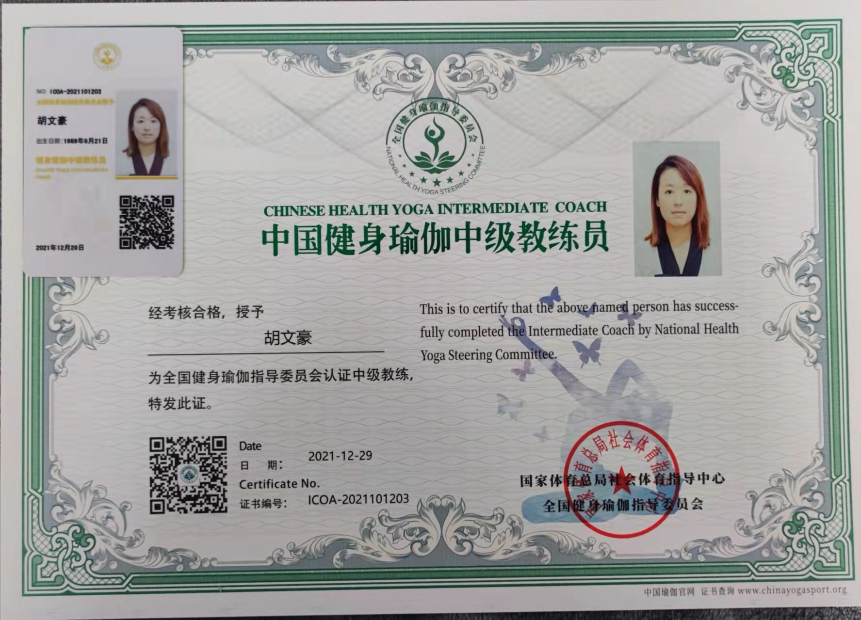 胡文豪中国健身瑜伽中级教练员