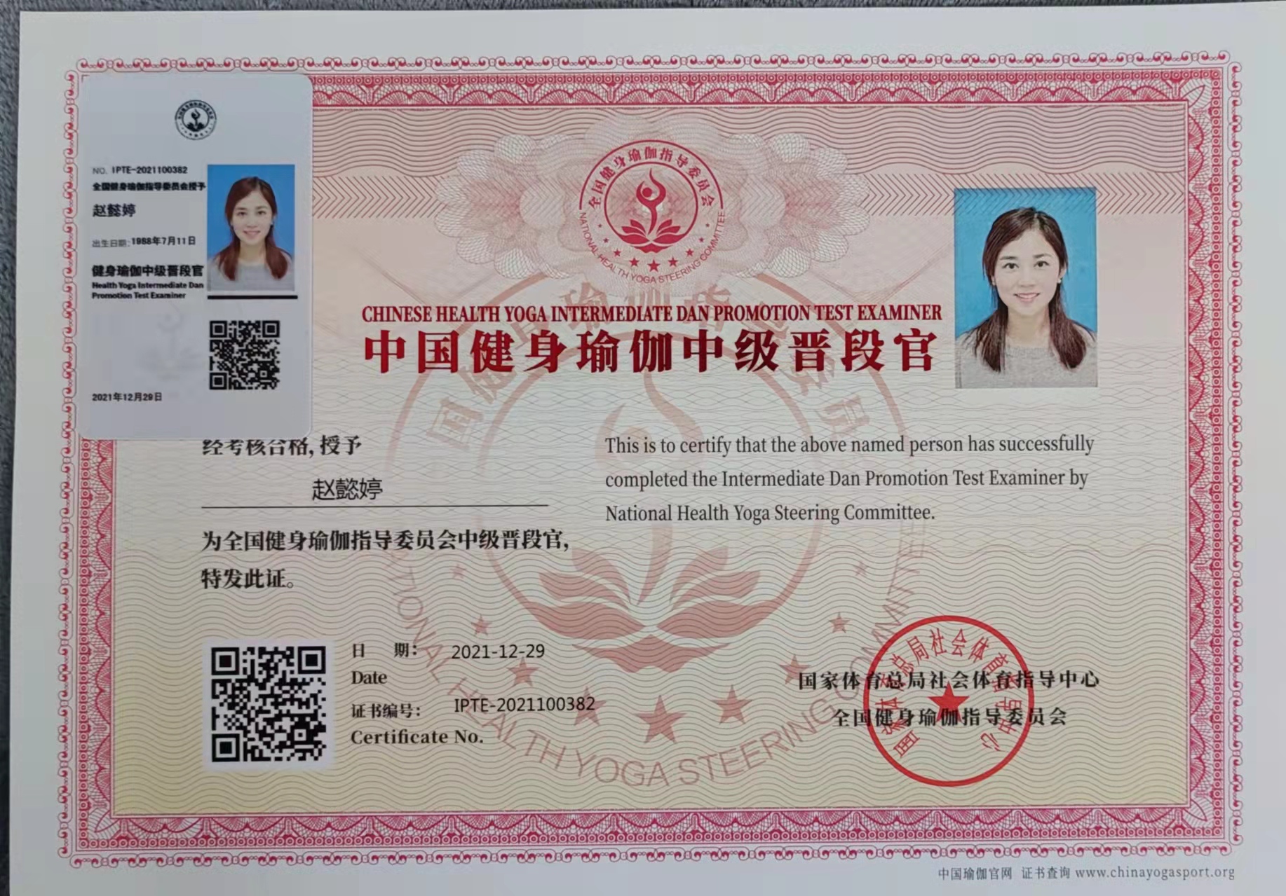 祝贺赵懿婷在西安薄珈梵歌五星级场馆荣获国家体育总局健身瑜伽中级晋段官
