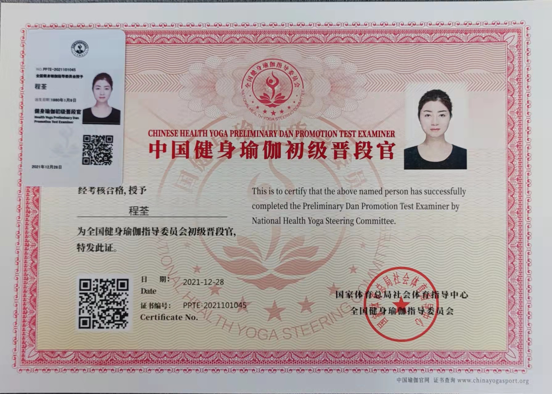 祝贺程荃在西安薄珈梵歌五星级场馆荣获国家体育总局健身瑜伽初级晋段官