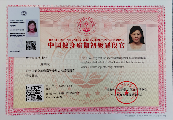 祝贺周靖玫在西安薄珈梵歌五星级场馆荣获国家体育总局健身瑜伽初级晋段官
