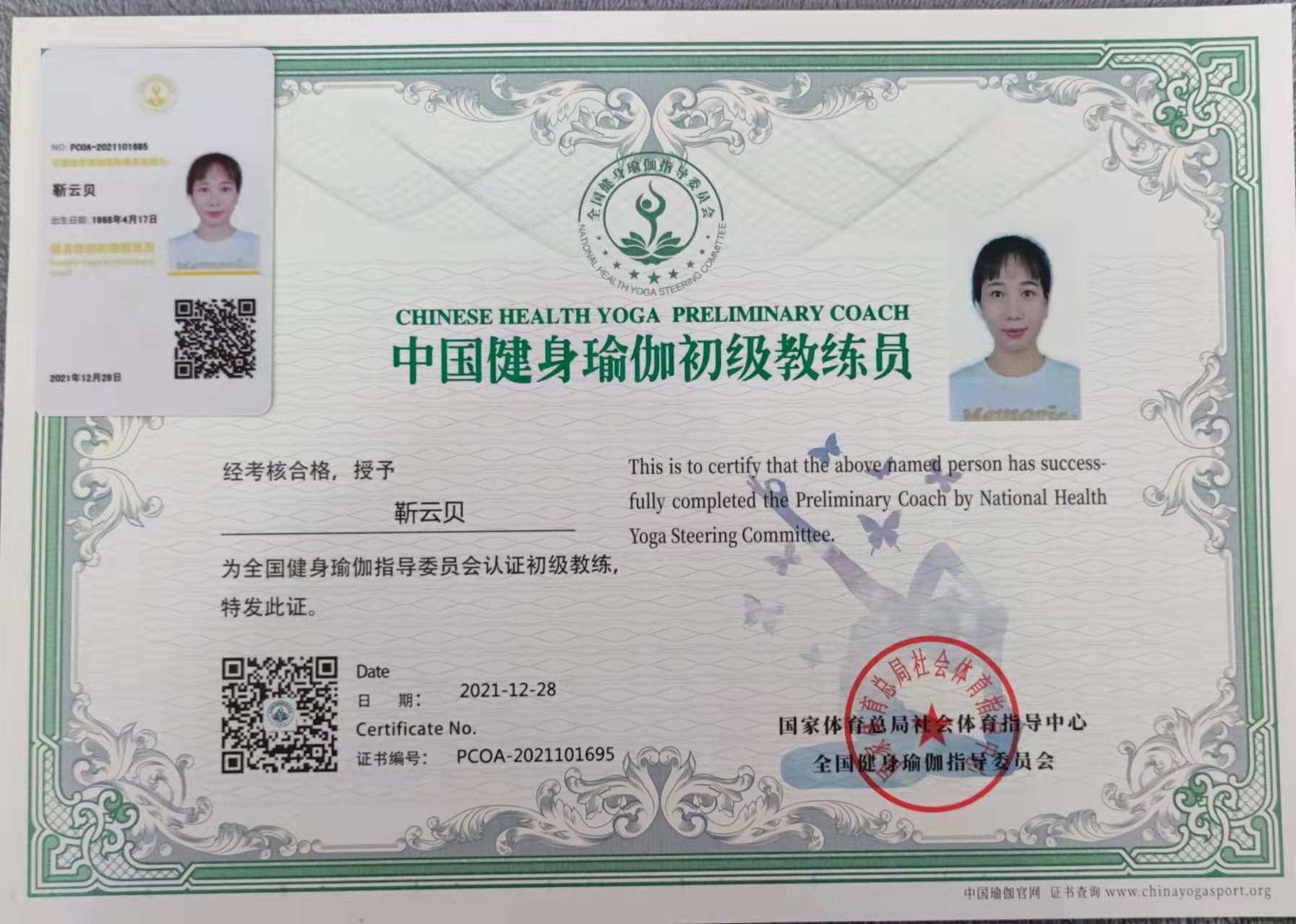 祝贺靳云贝在西安薄珈梵歌五星级场馆荣获国家体育总局健身瑜伽初级教练员