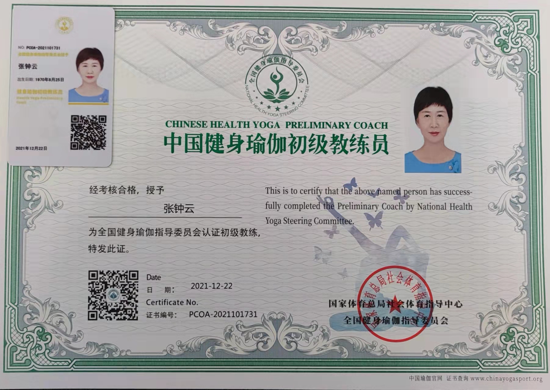 祝贺张钟云在西安薄珈梵歌五星级场馆荣获国家体育总局健身瑜伽初级教练员