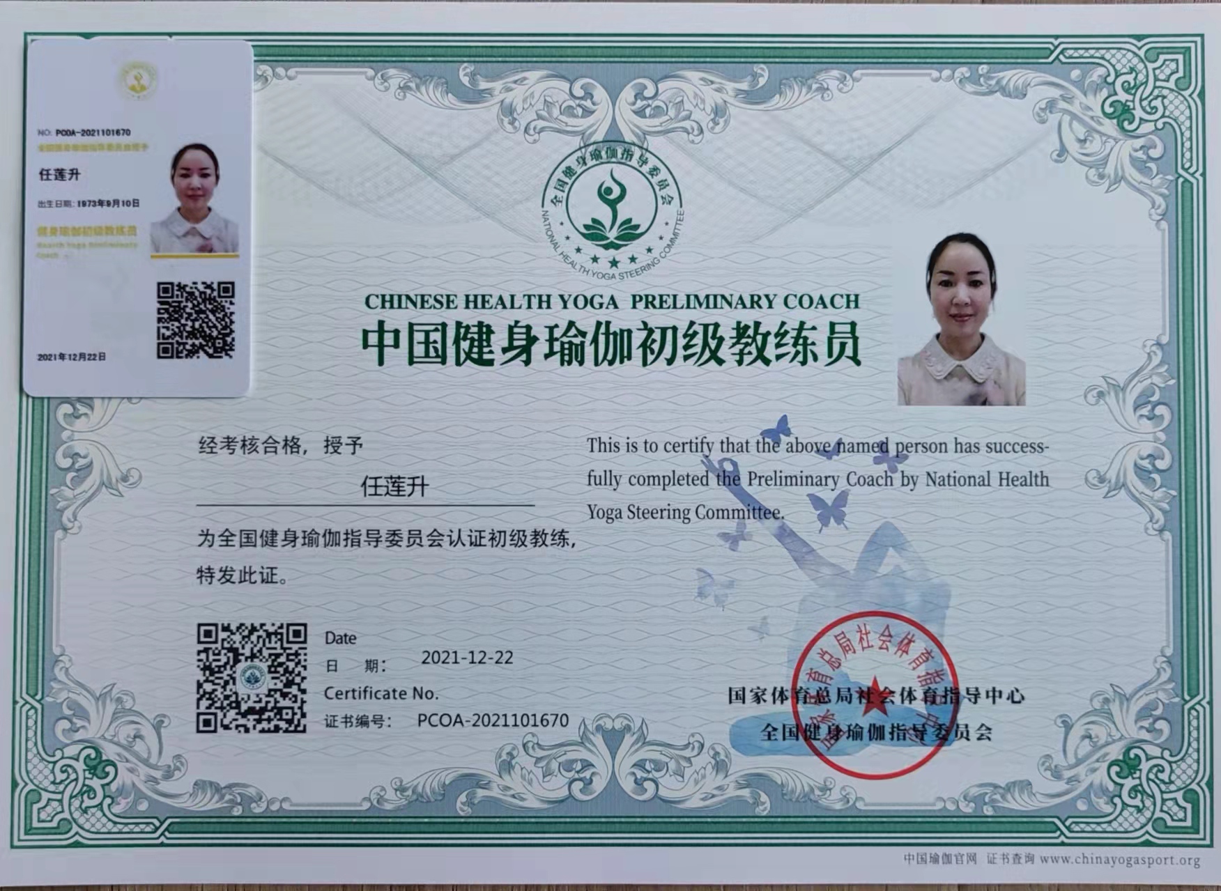 祝贺任莲升在西安薄珈梵歌五星级场馆荣获国家体育总局健身瑜伽初级教练员