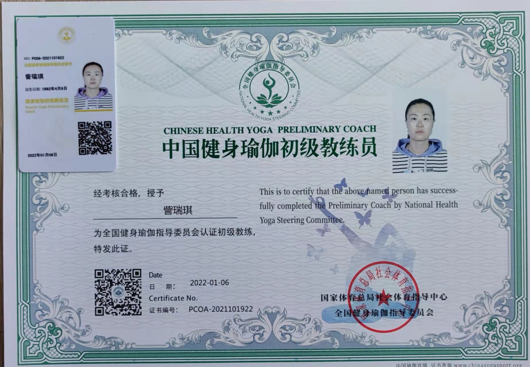 訾瑞琪中国健身瑜伽初级教练员
