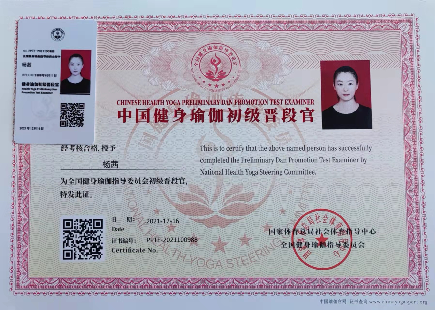 祝贺杨茜在西安薄珈梵歌五星级场馆荣获国家体育总局健身瑜伽初级晋段官