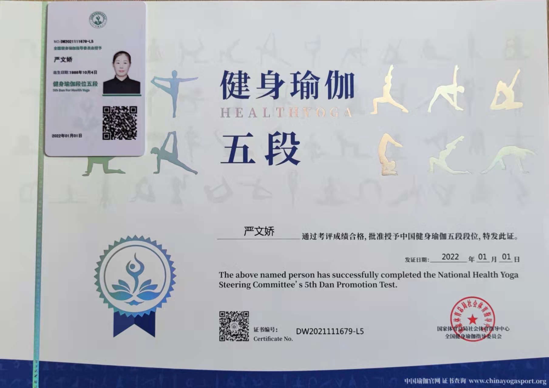 祝贺严文娇在西安薄珈梵歌五星级场馆荣获国家体育总局健身瑜伽五段段位
