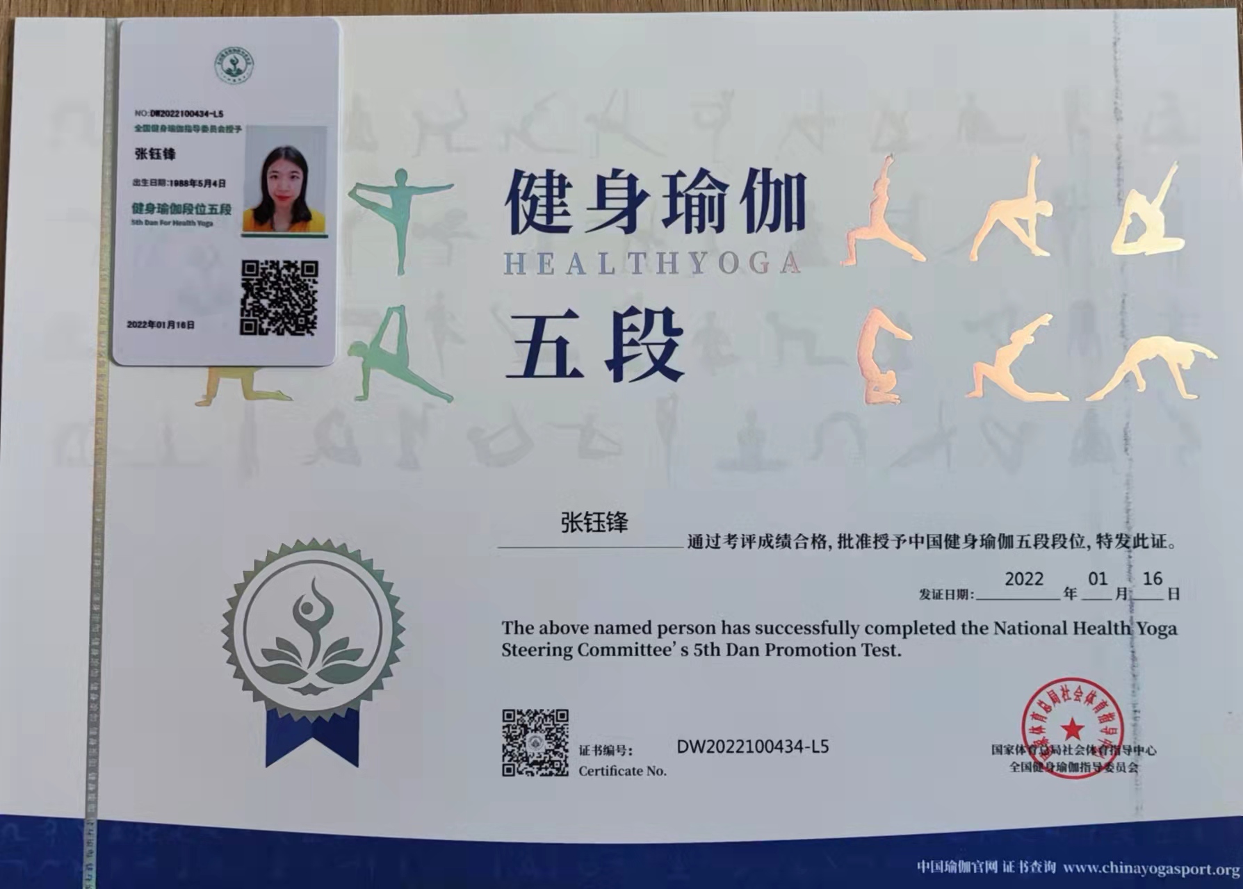 祝贺张钰锋在西安薄珈梵歌五星级场馆荣获国家体育总局健身瑜伽五段段位