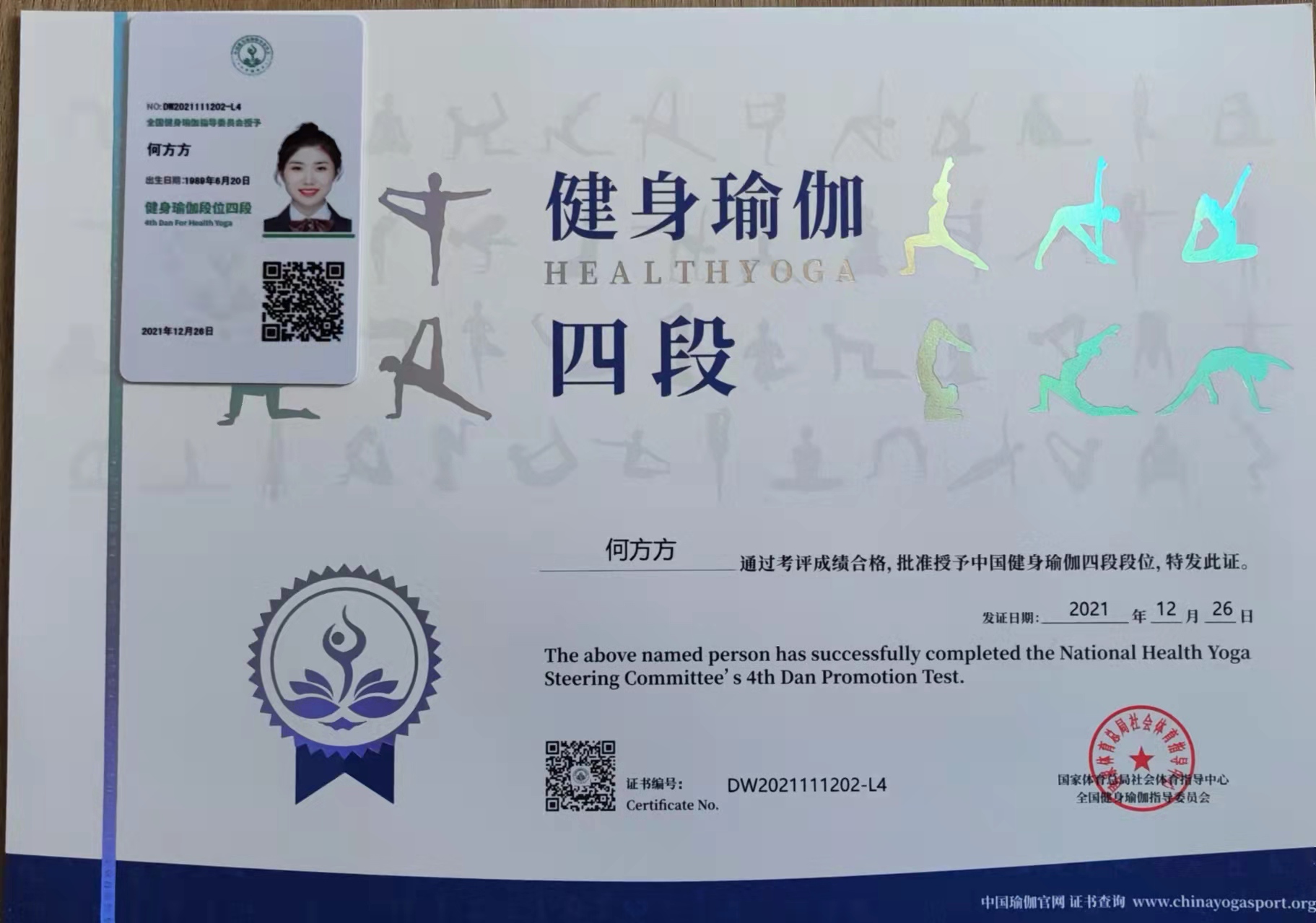 祝贺何方方在西安薄珈梵歌五星级场馆荣获国家体育总局健身瑜伽四段段位