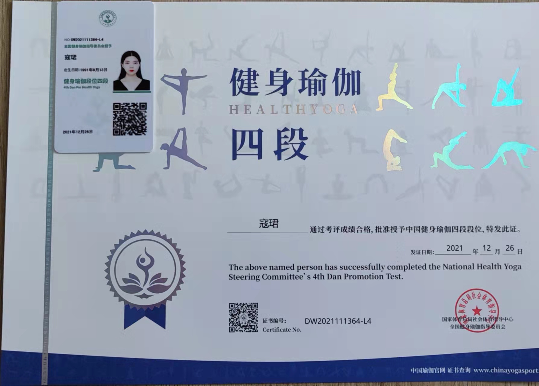 祝贺寇珺在西安薄珈梵歌五星级场馆荣获国家体育总局健身瑜伽四段段位