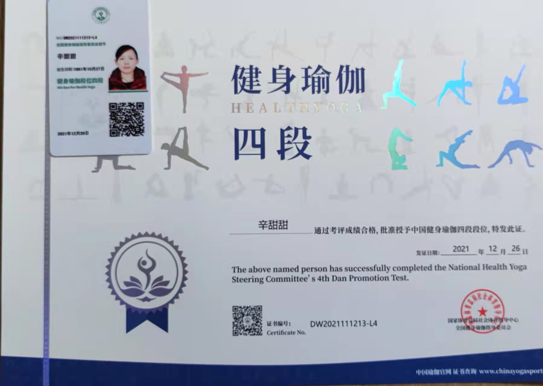 祝贺辛甜甜在西安薄珈梵歌五星级场馆荣获国家体育总局健身瑜伽四段段位