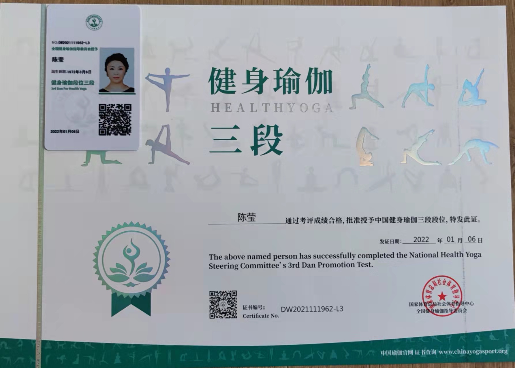 祝贺陈莹在西安薄珈梵歌五星级场馆荣获国家体育总局健身瑜伽三段段位