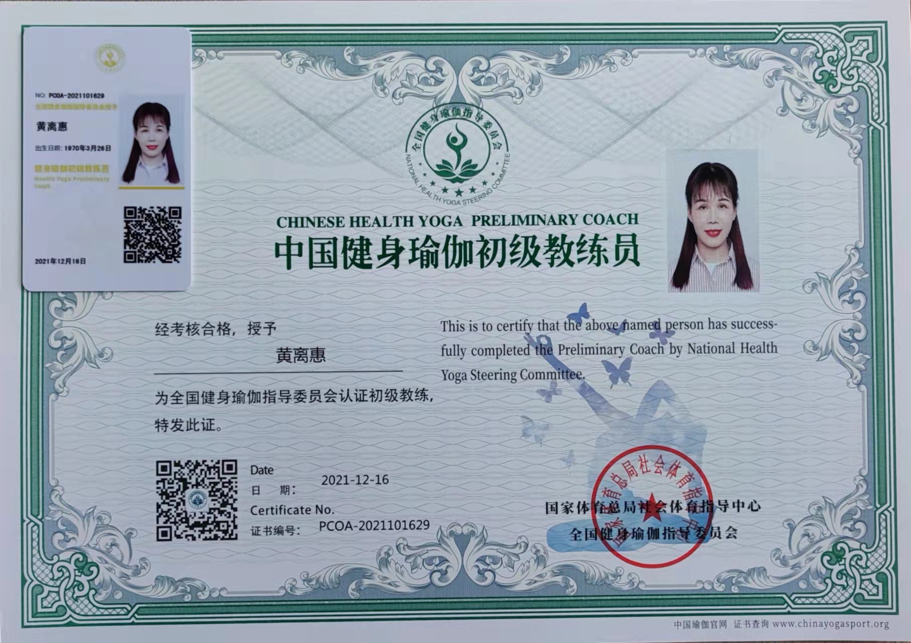 祝贺黄离惠在西安薄珈梵歌五星级场馆荣获国家体育总局健身瑜伽初级教练员