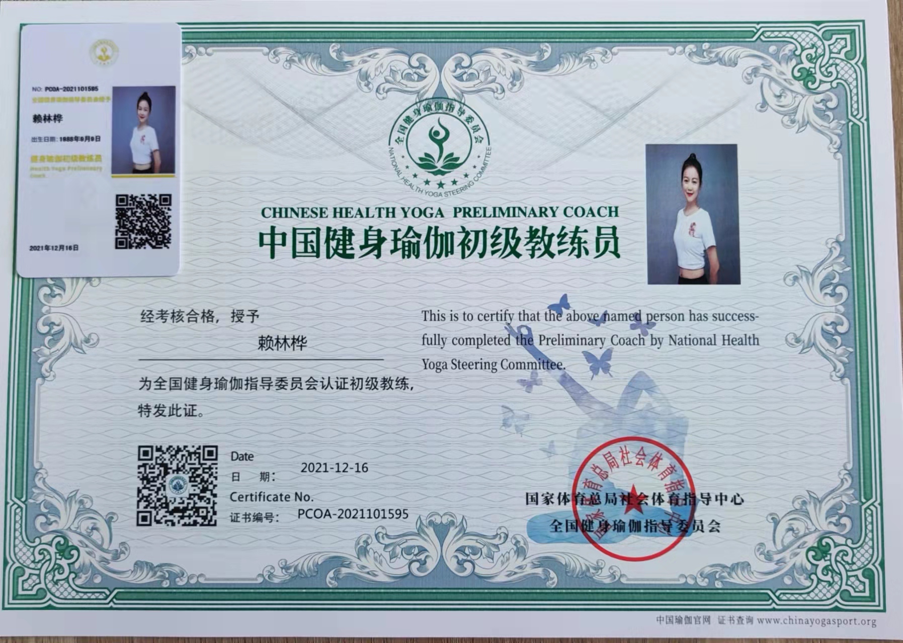 祝贺赖林桦在西安薄珈梵歌五星级场馆荣获国家体育总局健身瑜伽初级教练员