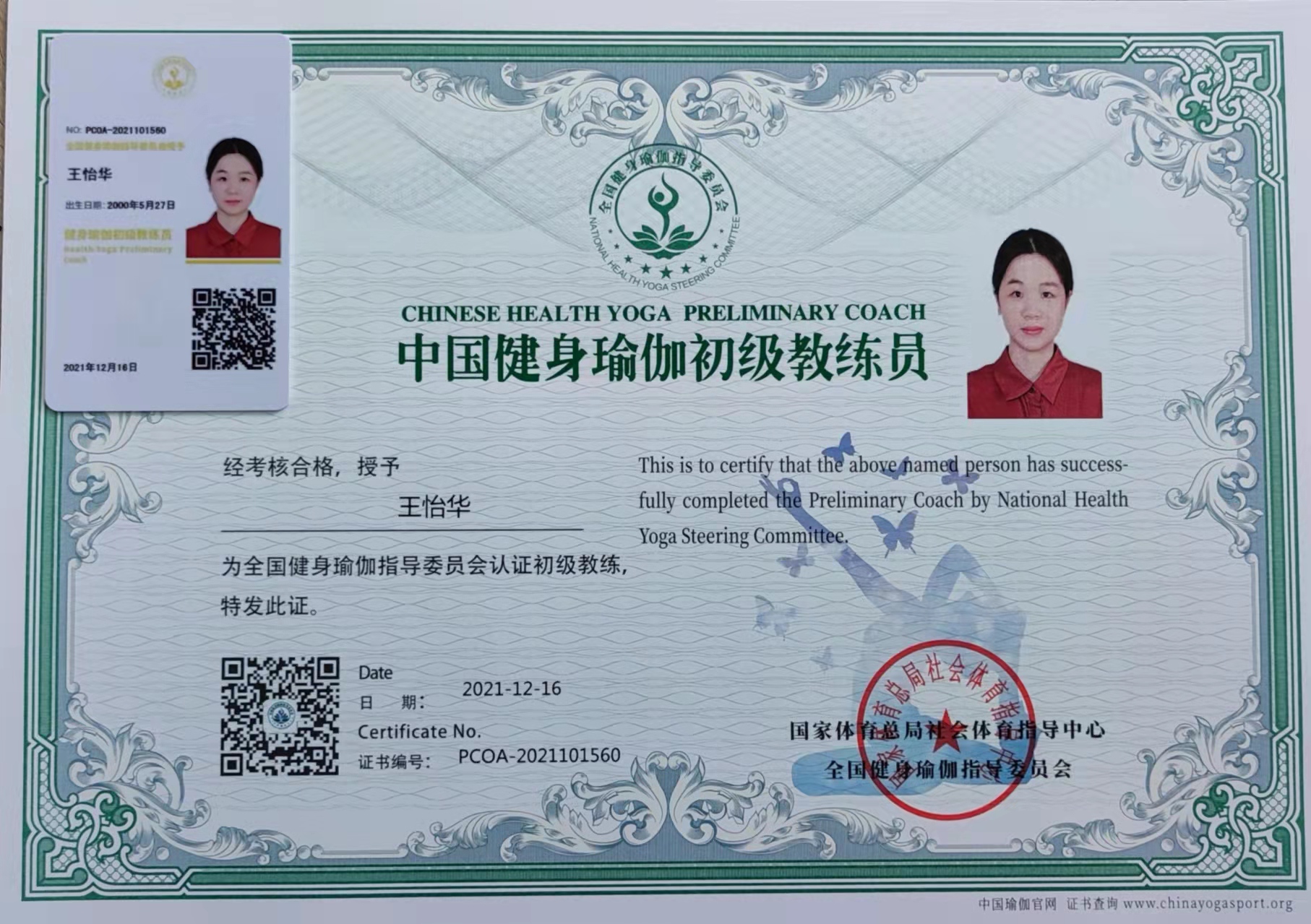 祝贺王怡华在西安薄珈梵歌五星级场馆荣获国家体育总局健身瑜伽初级教练员