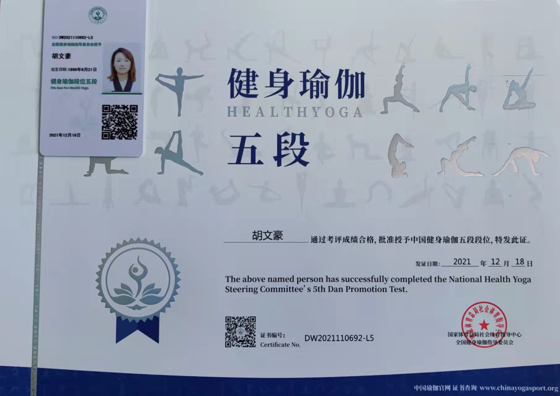 祝贺胡文豪在西安薄珈梵歌五星级场馆荣获国家体育总局健身瑜伽五段段位