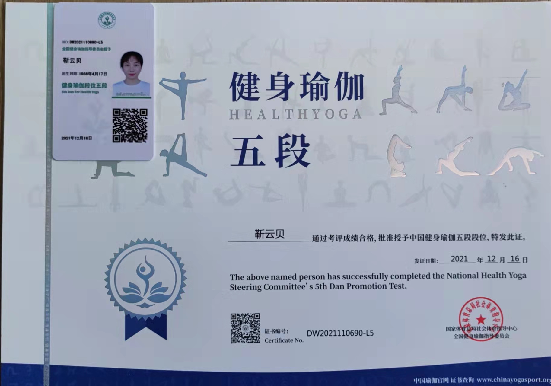 祝贺靳云贝在西安薄珈梵歌五星级场馆荣获国家体育总局健身瑜伽五段段位