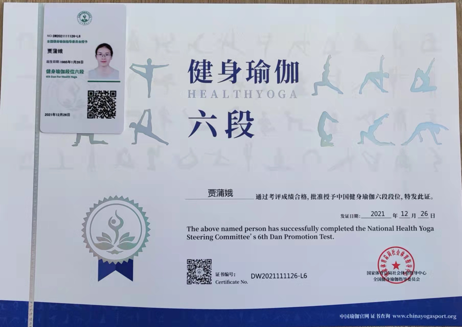 祝贺贾蒲娥在西安薄珈梵歌五星级场馆荣获国家体育总局健身瑜伽六段段位