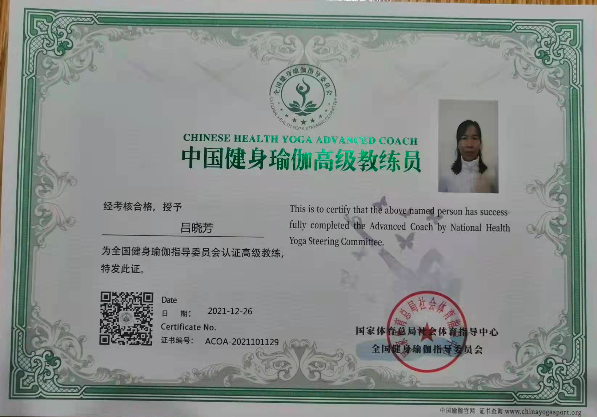 祝贺吕晓芳在西安薄珈梵歌五星级场馆荣获国家体育总局健身瑜伽高级教练员