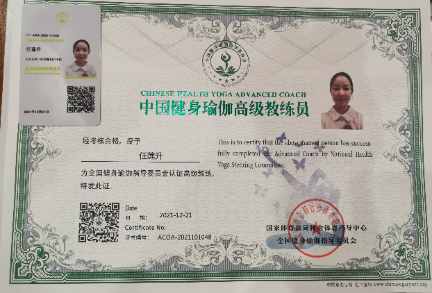祝贺任莲升在西安薄珈梵歌五星级场馆荣获国家体育总局健身瑜伽高级教练员