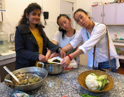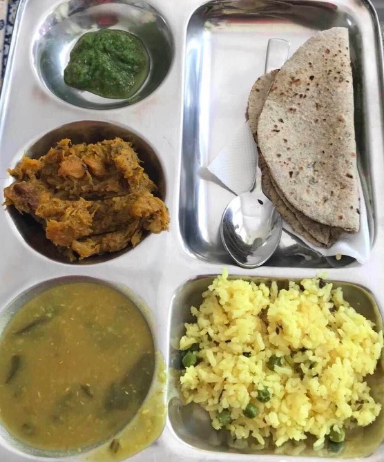 整个瑞诗凯诗严禁烟酒,餐饮百分之百皆为素食,商家不允许使用塑料袋。全素食成为我们的每日三餐。早餐以水果为主,午餐或米饭或poha,蔬菜,汤,印度薄饼(chapati), 晚餐则一般都是粥加汤。加了淡淡香料与咖喱的素食很好吃,吃下去肠胃感觉很舒服,没有负担。十多天过去,也没有馋肉的感觉。