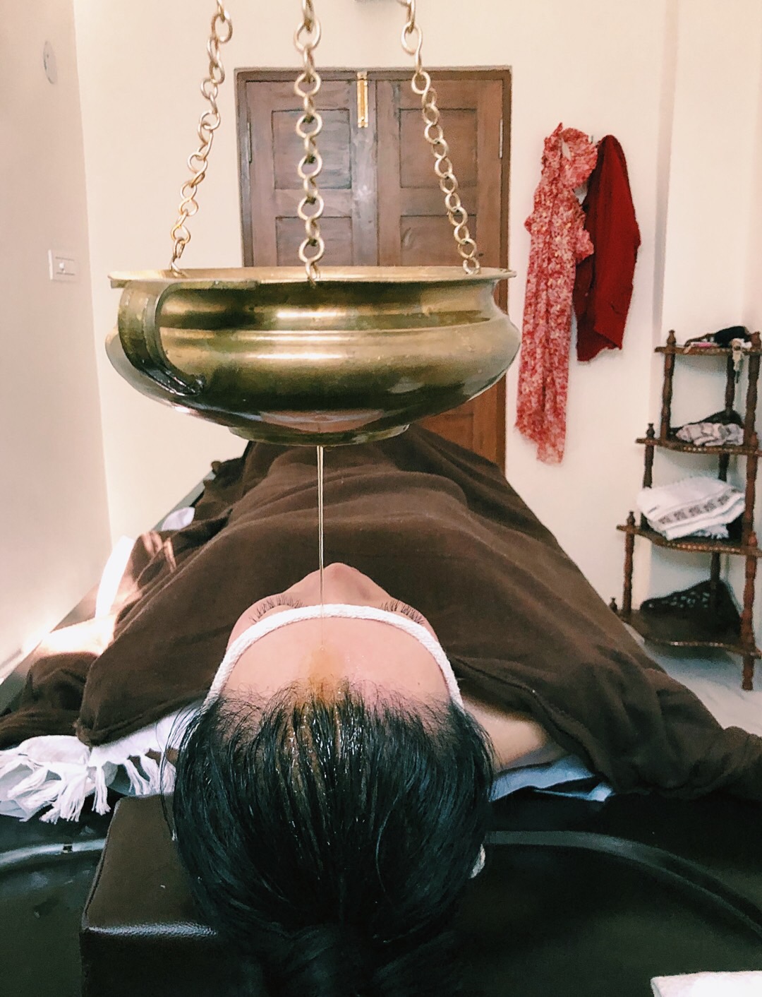 滴油灌顶疗法(Shirodhara),则是用烫得温温的精油,盛在有洞的壶里,悬在平躺在床的人的额头上端。