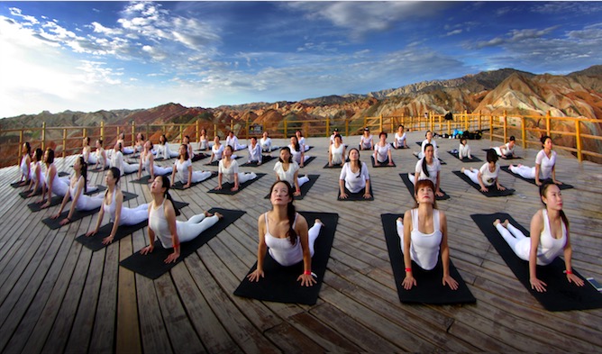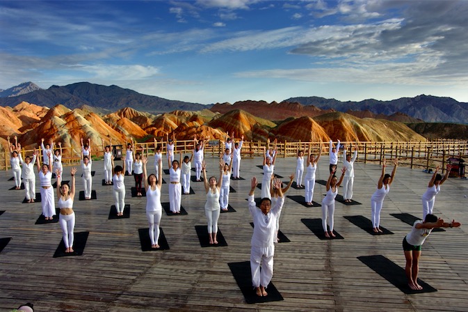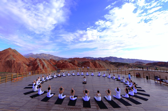 2017年张掖印橡瑜伽组织丹霞地质公园户外公益瑜伽,由瑜伽科学研究中心主任谢芳老师口令,张掖市瑜伽协会会长王景峰老师及薄珈梵歌学院院长邓黎军老师前面带领。